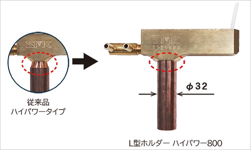 English ,http://gdata.youtube.com/feeds/api/videos/eTDjST7__iU,,{"playerWidth":"640","useCustom":false,"autoPlay":false,"autoLoop":false,"autoNext":false,"quality":"default","qualityName":"自動","coverImage":""} 概要 L型ホルダーは、奥行きの深いワークなどの溶接に向いています。 ・特許登録 特長 ホルダーつけ根部分の強度アップ ホルダーの結合部分をφ32に変更することで強度をアップさせました。 1トンもの高加圧力にも耐えられる! 加圧時のたわみ量が極端に少ないため溶接品質が安定します。 5.0kN(約500kgf)を超える高加圧力の作業に最適です。 分割構造により、特注対応が可能 アームとホルダーが分割構造のため、標準サイズ以外での特注品も製作できます。 ぜひお問合せ下さい。 WEBカタログ 購入する 関連製品 ハイパワーL型ホルダー C型ホルダー ストレートチップ シャンク